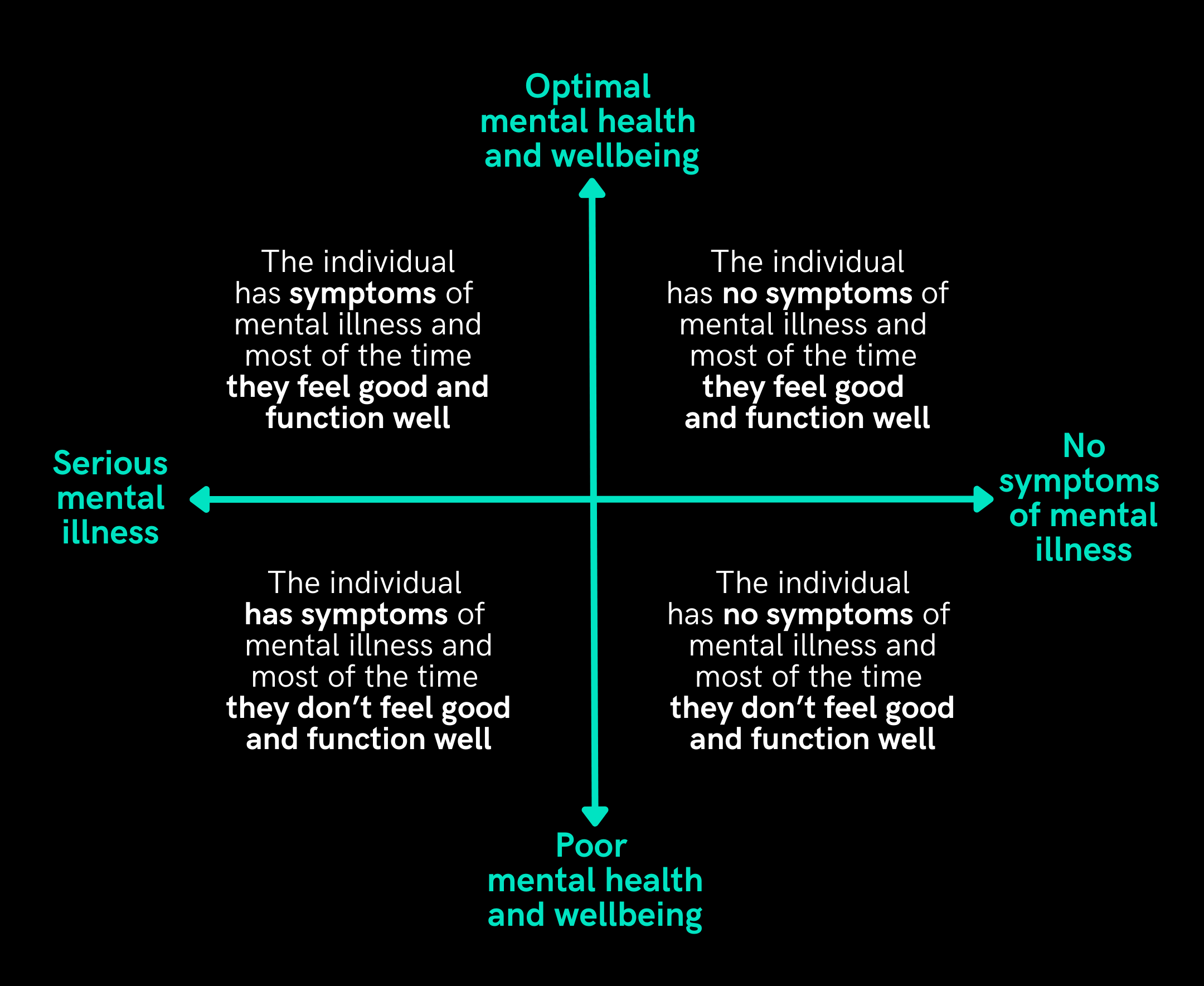 A vertical axis represents the presence or absence of mental illness, with symptoms of mental illness on the left and no symptoms on the right. The horizontal axis represents the level of mental health, with optimal mental health at the top and poor mental health at the bottom.